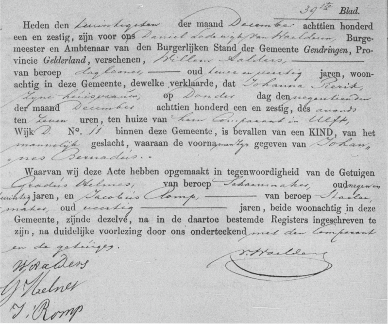 Geboortedocument van Hendrik Jan op 06-09-1781 te Ulft. Zoon van Hendrik Aalders en Nelken Bruns.
