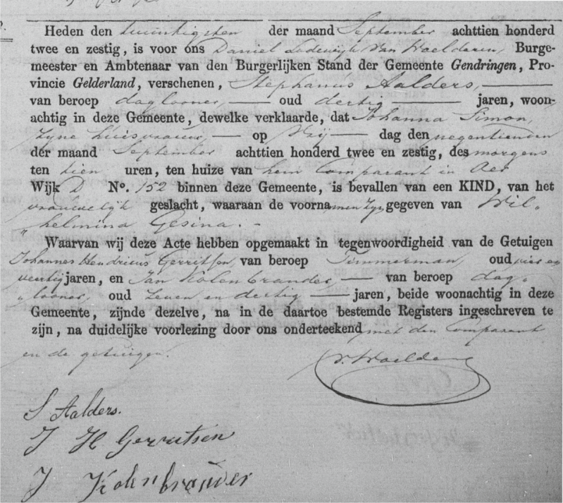 Dochter van Stephanus Aalders, Akkerbouwer 50 jaar oud, en Grada Jansen. (Zijnen huisvrouw)
