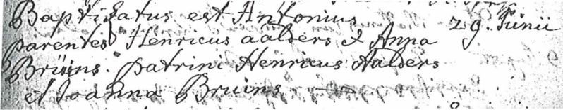 Geboortedocument van Antonius op 29-06-1776 te Ulft. Zoon van Henricus Aalders en Anna Bruins.