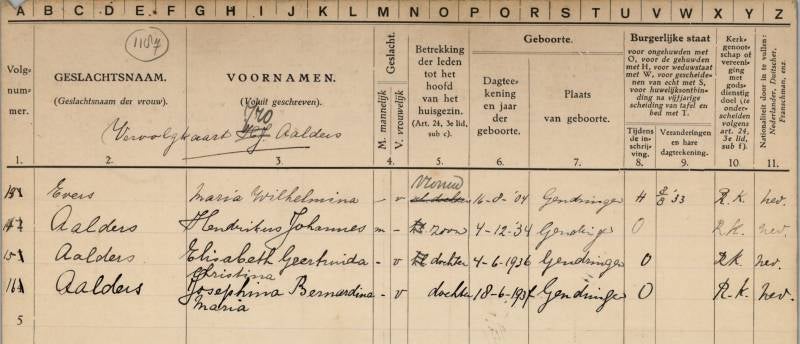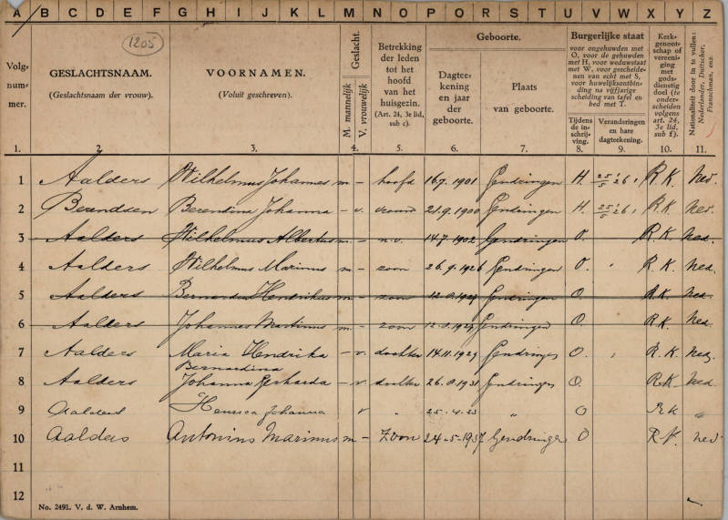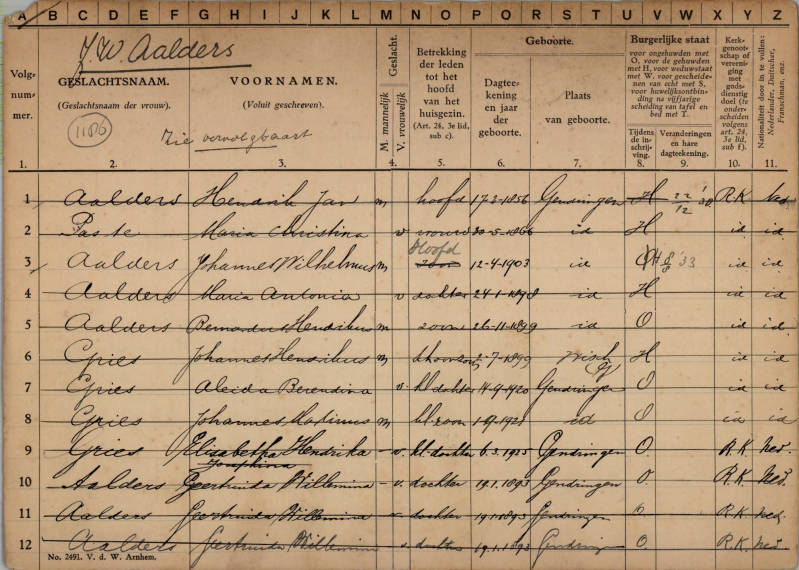 Gezinskaart Wilhelmus Albertus Aalders en Maria Hendrika Schepers.