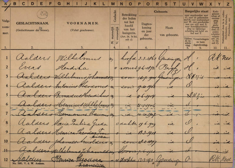Gezinskaart van Wilhelmus Johannes Aalders en Berendina Johanna Berendsen.