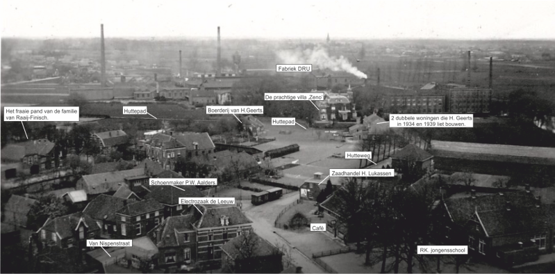 In 1934 ging Hent Geerts in één van zijn 4 gebouwde huizen wonen aan de Hutteweg. Geheel links de fraaie villa van Raaij uit 1892.