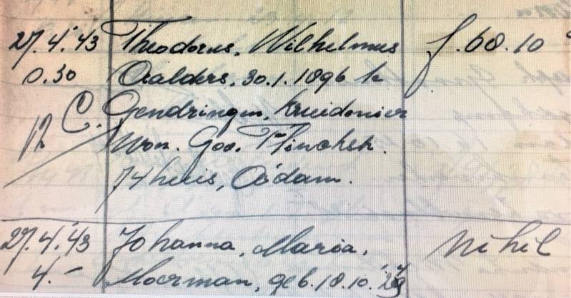 < In het politierapport te Amsterdam werd op de datum van hechtenis 27-04-1943 om 0.30 een bedrag van 68,10 genoteerd dat op dat moment in het bezit was van Theodorus Wilhelmus Aalders.