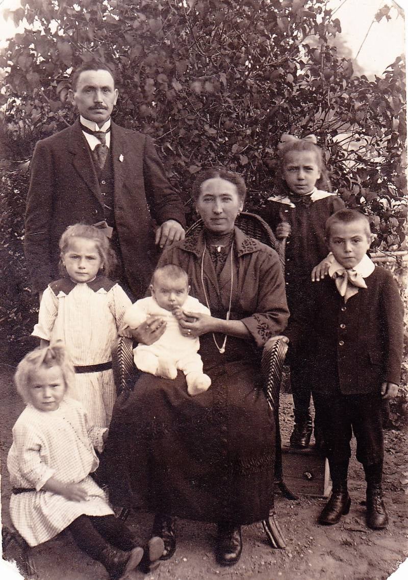 < Op deze prachtige foto uit 1923 zien we Wilhelmus (Willem) met zijn vrouw Johanna (Anna) Geerts met 5 van hun kinderen, Elisabeth (1914), Hendrikus (1915), Helena (1917), Bernardina (1918) en de kleinste Johannes (1922.)