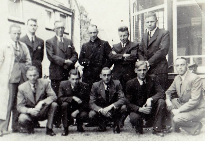 < Onbekend waar deze foto werd gemaakt. Zittend in het midden is Jan Aalders en geheel recht Henk Aalders.